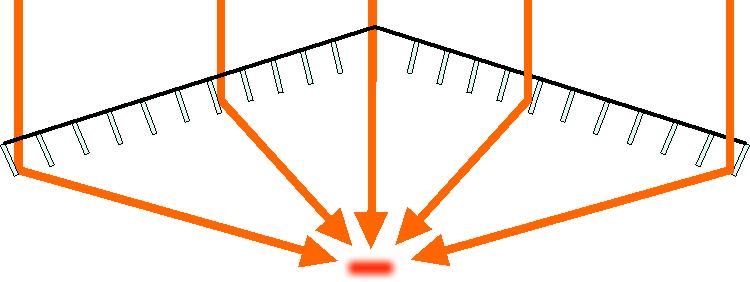The slat-array has a quite unique optical configuration although some analogy can be drawn with the optical design known as the linear Fresnel reflector (LFR). However, the principal difference between SAC and LFR is that the slat reflectors of SAC are inclined at more oblique angles to the normal of the concentrator’s aperture. This results in the convergent beam of sunlight passing through the concentrator structure into the spaces between the adjacent reflectors. Thus, SAC is a forward-reflecting optical system with the focus on the rear whereas LFR is a retro-reflecting system with the focus formed above the collector.