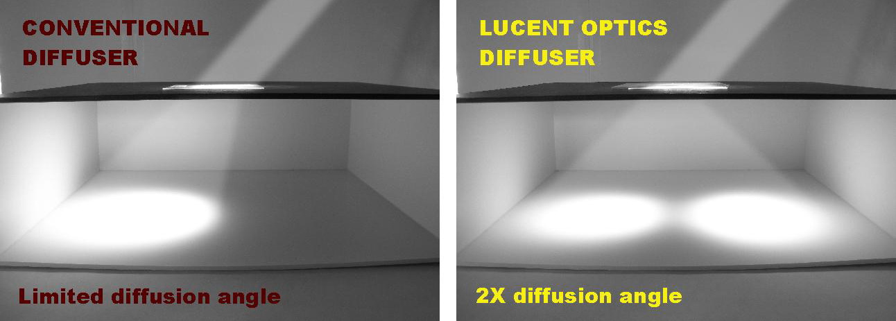 Researchers at Lucent Optics have invented an advanced sheet-form diffuser which provides a very broad angular spread while preserving the optical transmittance of an optically clear material. The diffuser features a perpendicular grid of deep and narrow channels which reflect off-axis light with high efficiency using the total internal reflection (TIR).