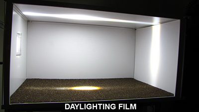 Daylighting Film captures sunlight that would otherwise hit the floor and redirects it to the ceiling using thousands of embedded microscopic reflectors that are practically invisible to the naked eye. The ceiling (which is usually white-painted) evenly scatters the redirected light throughout the space without the blinding glare usually associated with direct sunlight.