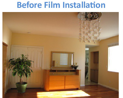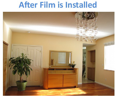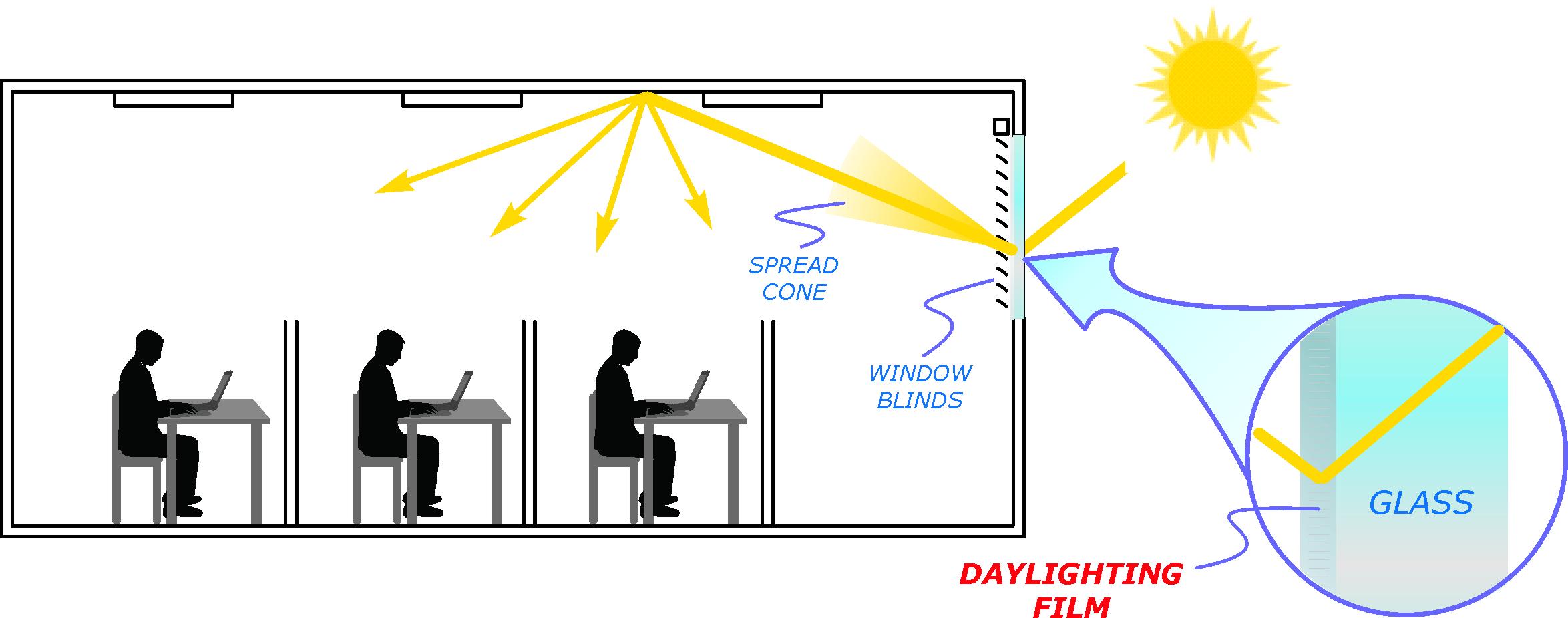 The film itself is very efficient and can redirect up to 70-90% of the high-elevation sunlight to the ceiling. In an "idealized" case with high ceilings and with a relatively large treated window area, interior illumination enhancement can be as high as 2-3 times and up to the depth of 30-40 ft compared to the case of untreated windows. In commercial offices, it could be sufficient to keep electric lights off for the most part of the work day and save up to 50-70% of electric energy used for lighting. However, the effectiveness of the installed product is dependent on many other factors such as the relative size of the treated area, window orientation, geographic location, configuration of the interior space, reflectance of the ceiling and other indoor materials, etc. Also, various external obstructions such as nearby structures, vegetation or building facade overhangs may significantly impact sidelighting performance. Accordingly, the installation of such product should be carefully planned.